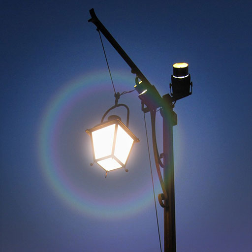 - Rainbow halos around lights.